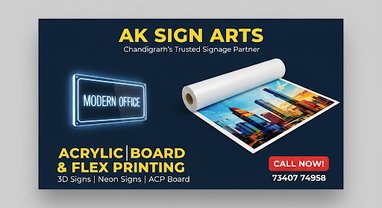 Immerse yourself in the world of seamless printing solutions at AK Sign Arts - Acrylic Board & Flex Printing, a versatile establishment that caters to all your printing and advertising needs since 2018. Known for their expertise in acrylic boards, flex printing, and captivating neon signs, AK Sign Arts has become the go-to provider for businesses in Chandigarh and Panchkula. Their unwavering commitment to quality has earned them a reputation for crafting visually striking designs, ensuring that every print and every campaign makes a lasting impression. With personalized service and a creative team, AK Sign Arts transforms your vision into tangible, impactful marketing material that will make you stand out.